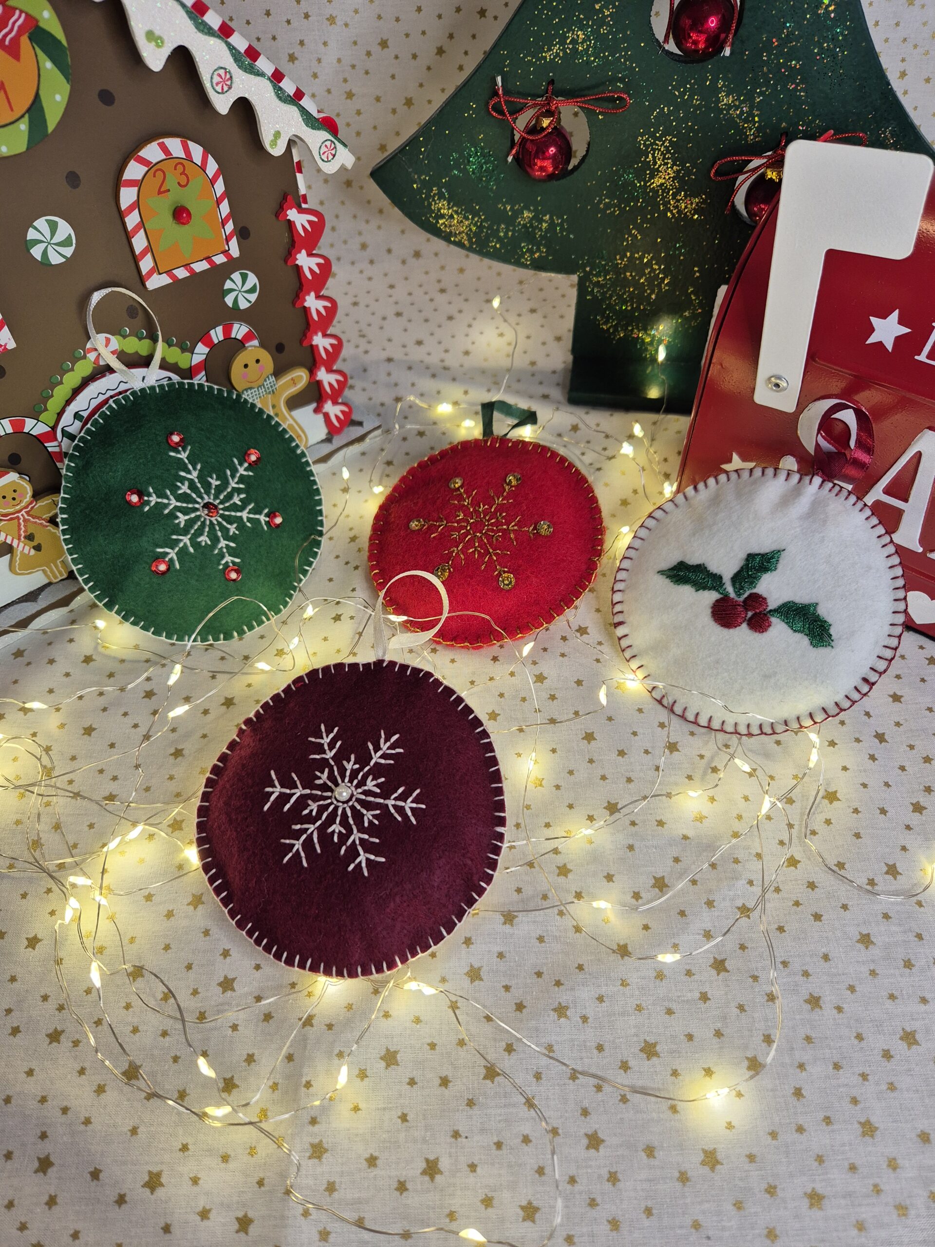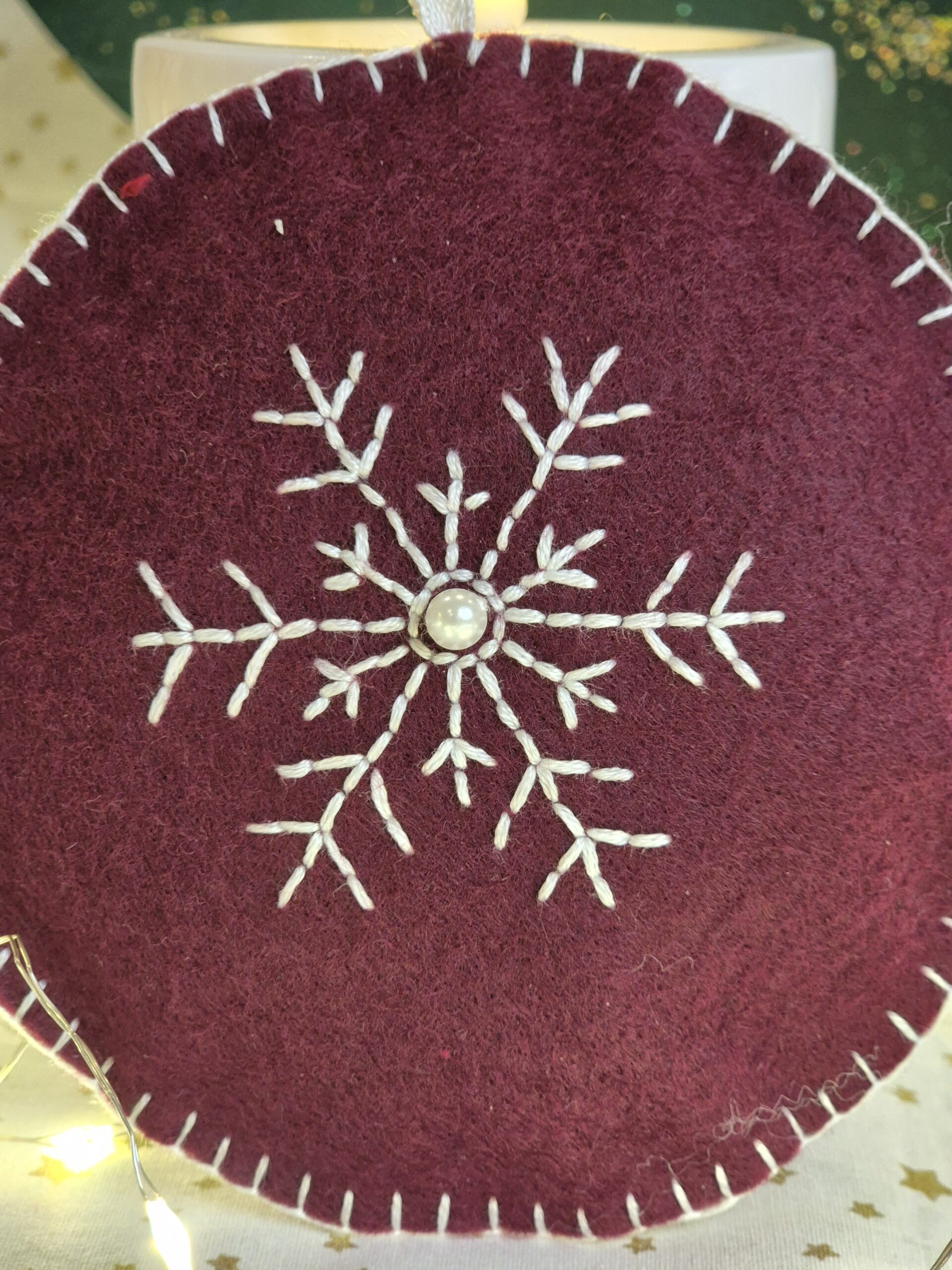 Décoration de Noël en forme de boule faite en feutrine brodée à la main par mes soins avec des fils moulinés de marque DMC 100% coton à double mercerisé, certifiés Oeko-Tex et du fil de marque DMC Diamant selon le modèle.
