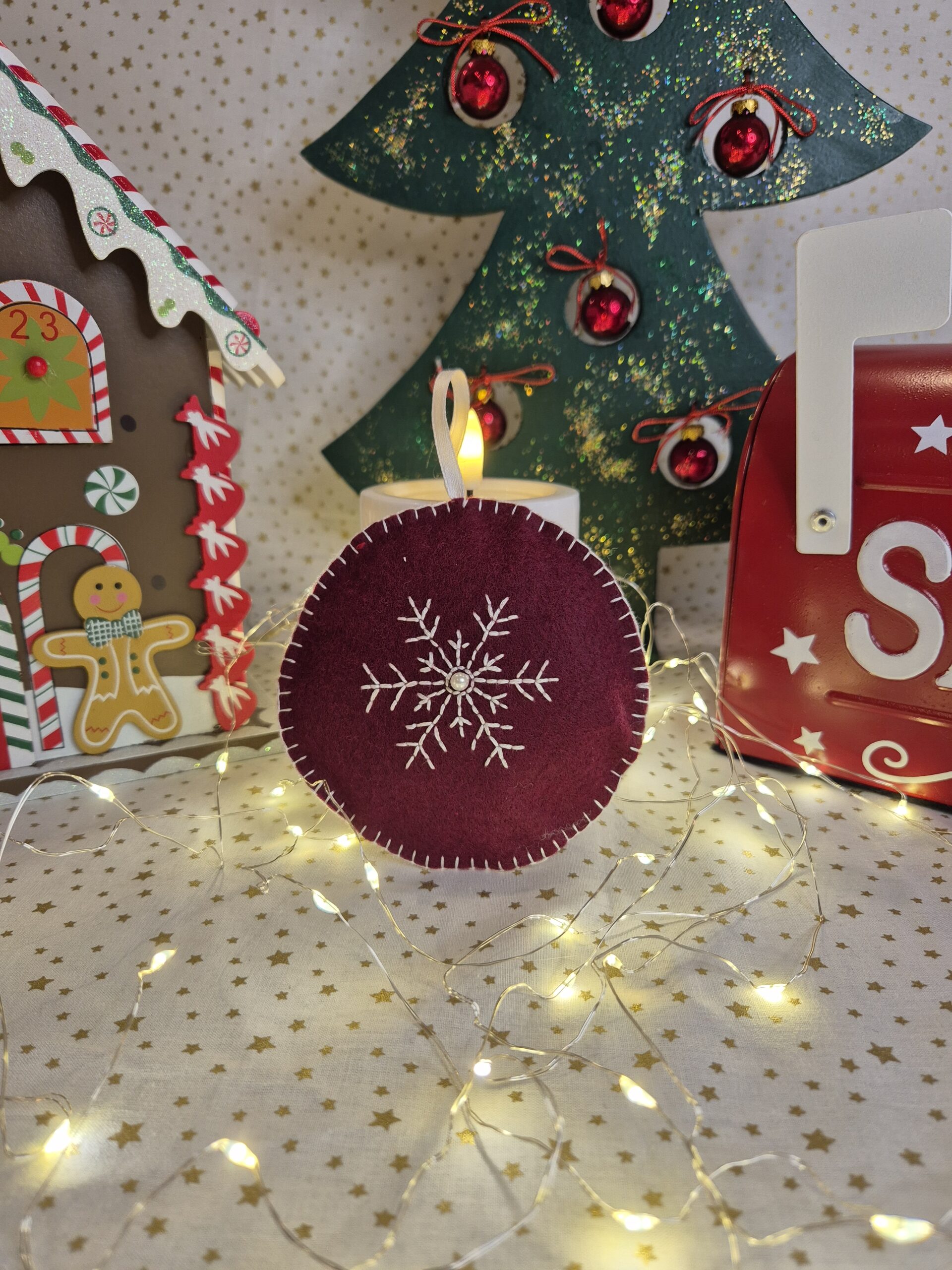 Décoration à suspendre modèle boule de noël en feutrine brodée à la main