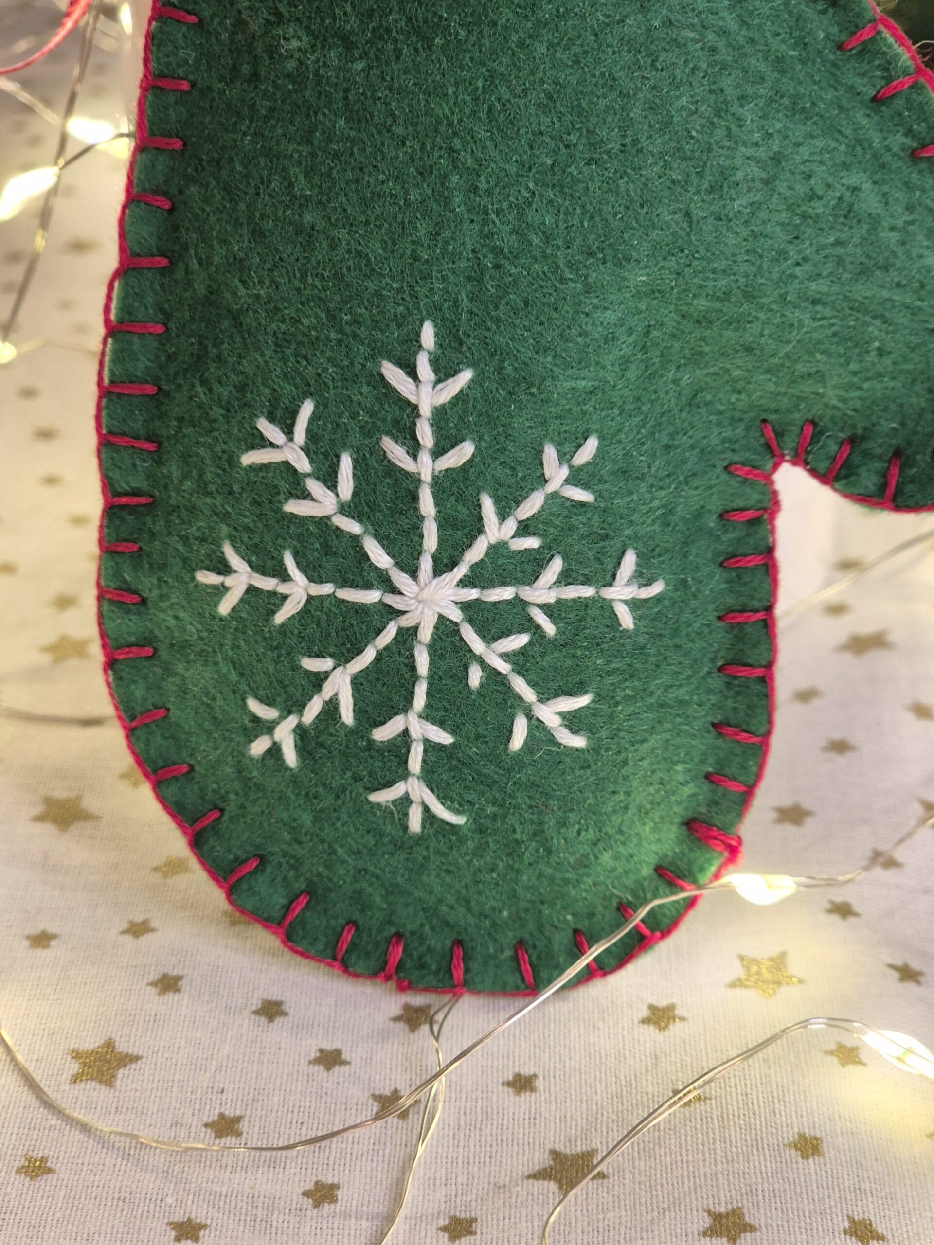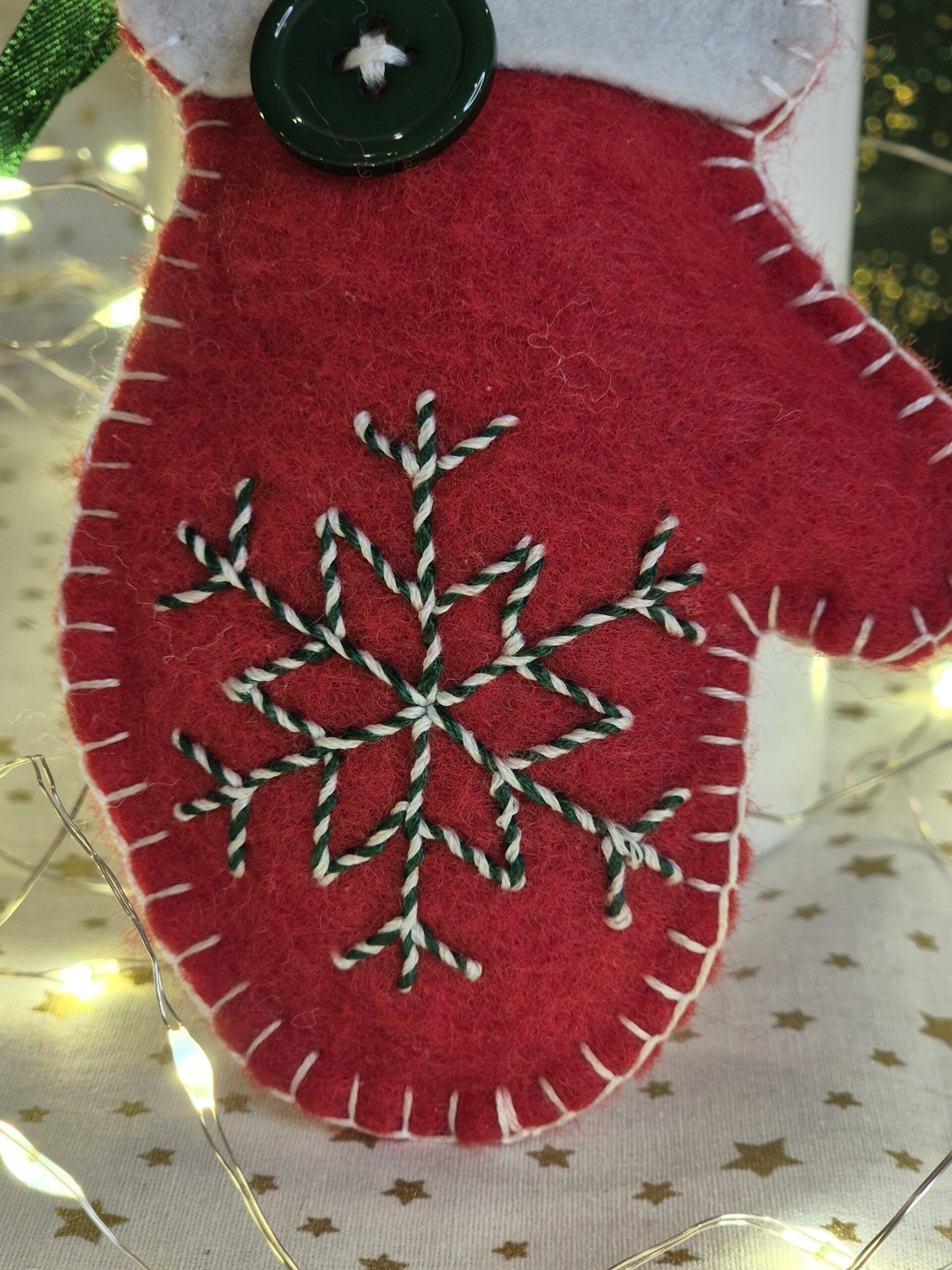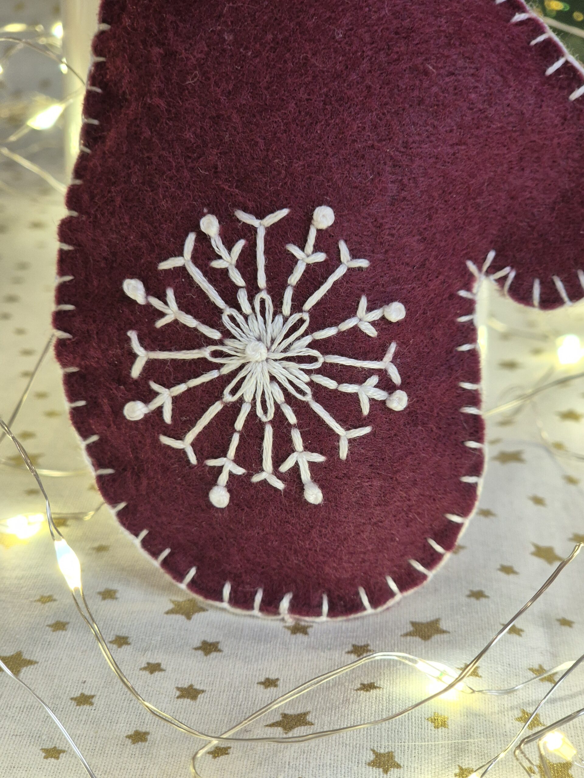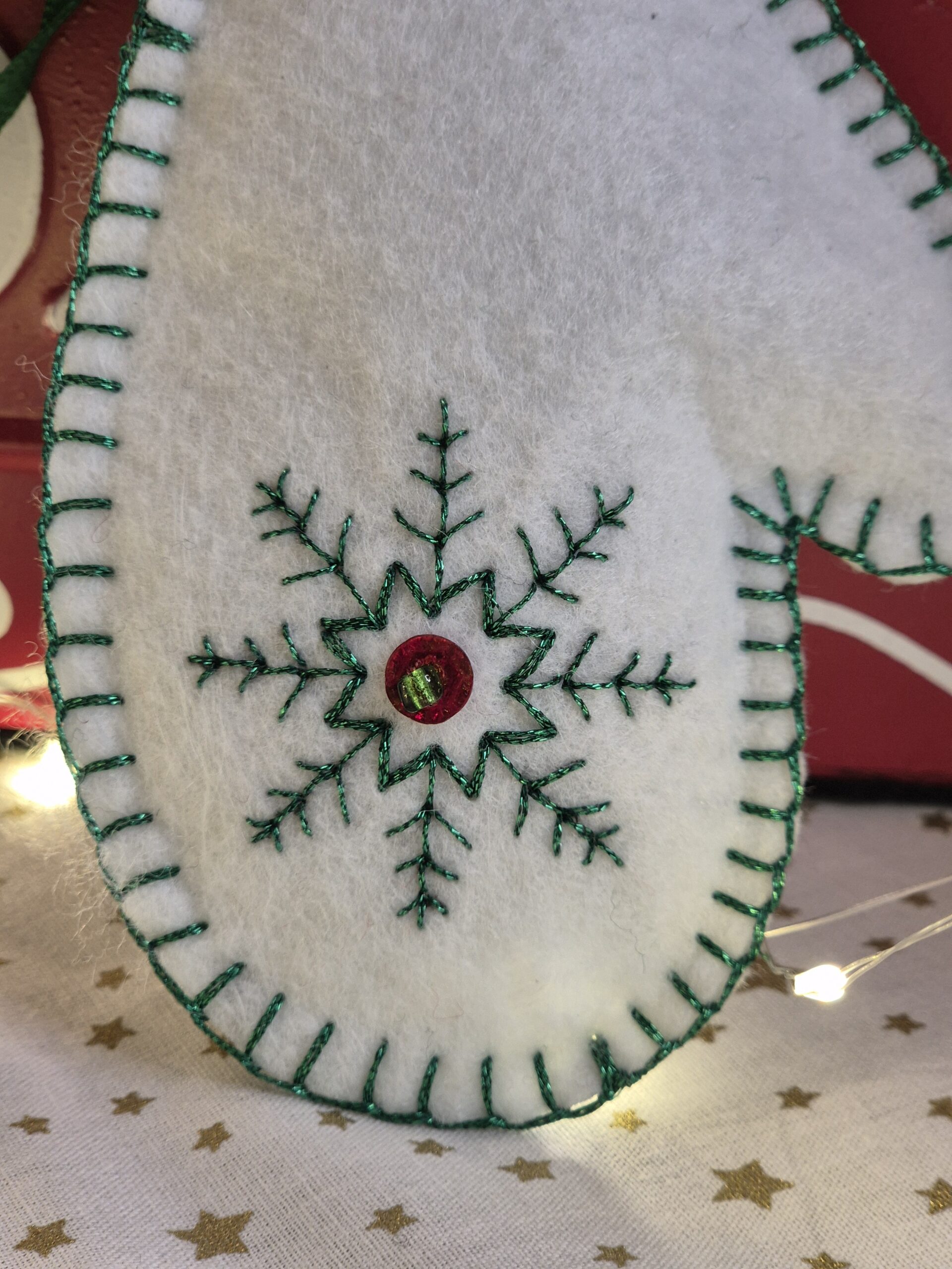 Décoration de Noël en forme de moufle faite en feutrine brodée à la main par mes soins avec des fils moulinés de marque DMC 100% coton à double mercerisé, certifiés Oeko-Tex et du fil de marque DMC Diamant selon le modèle.