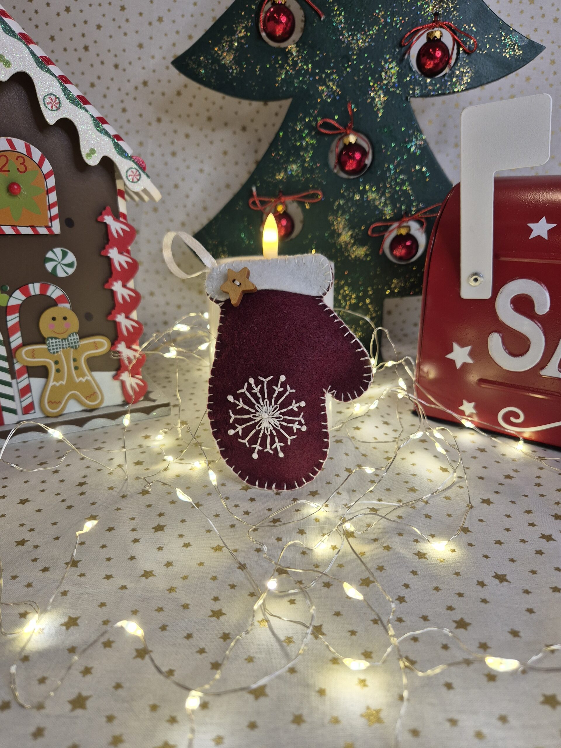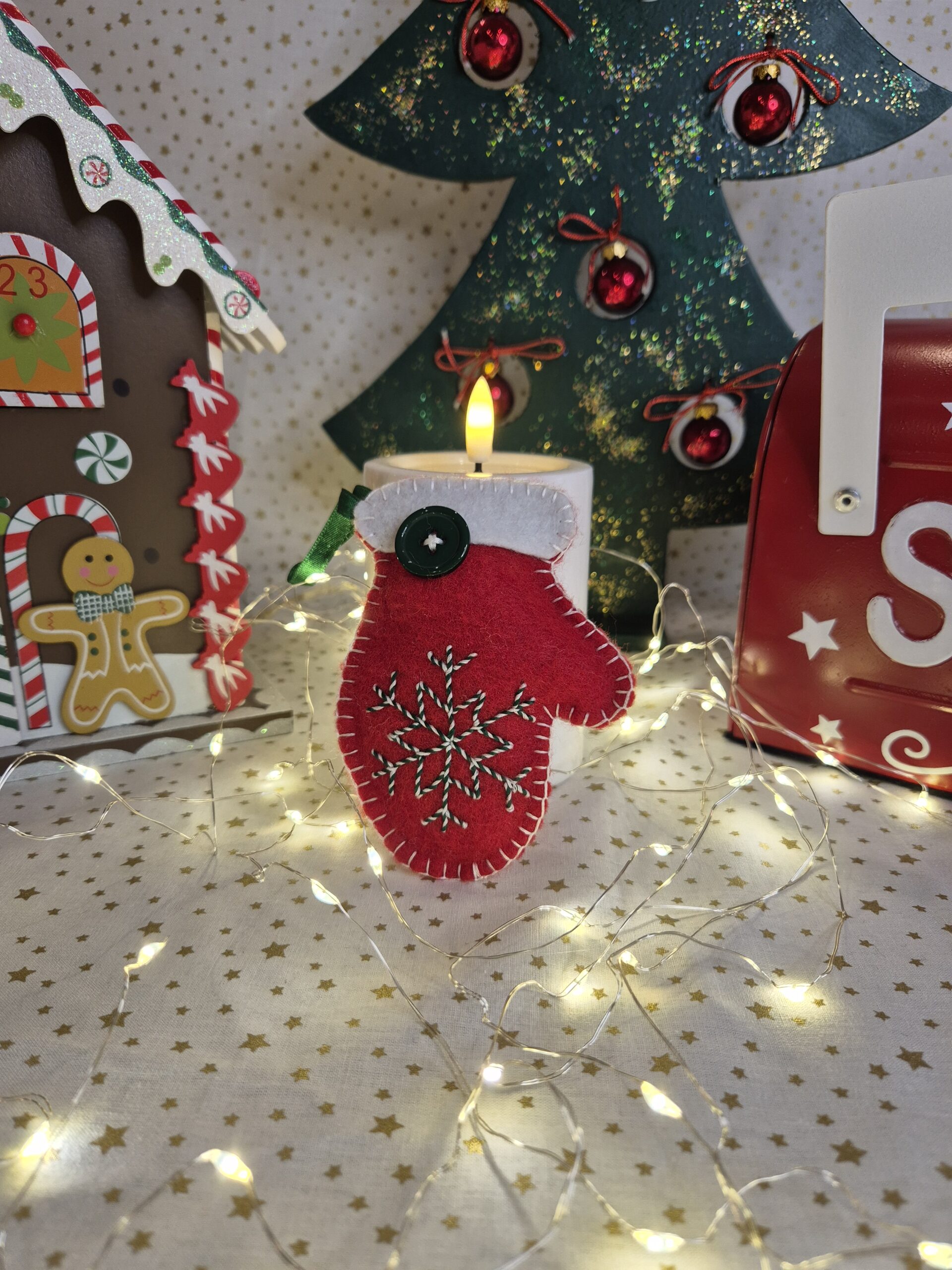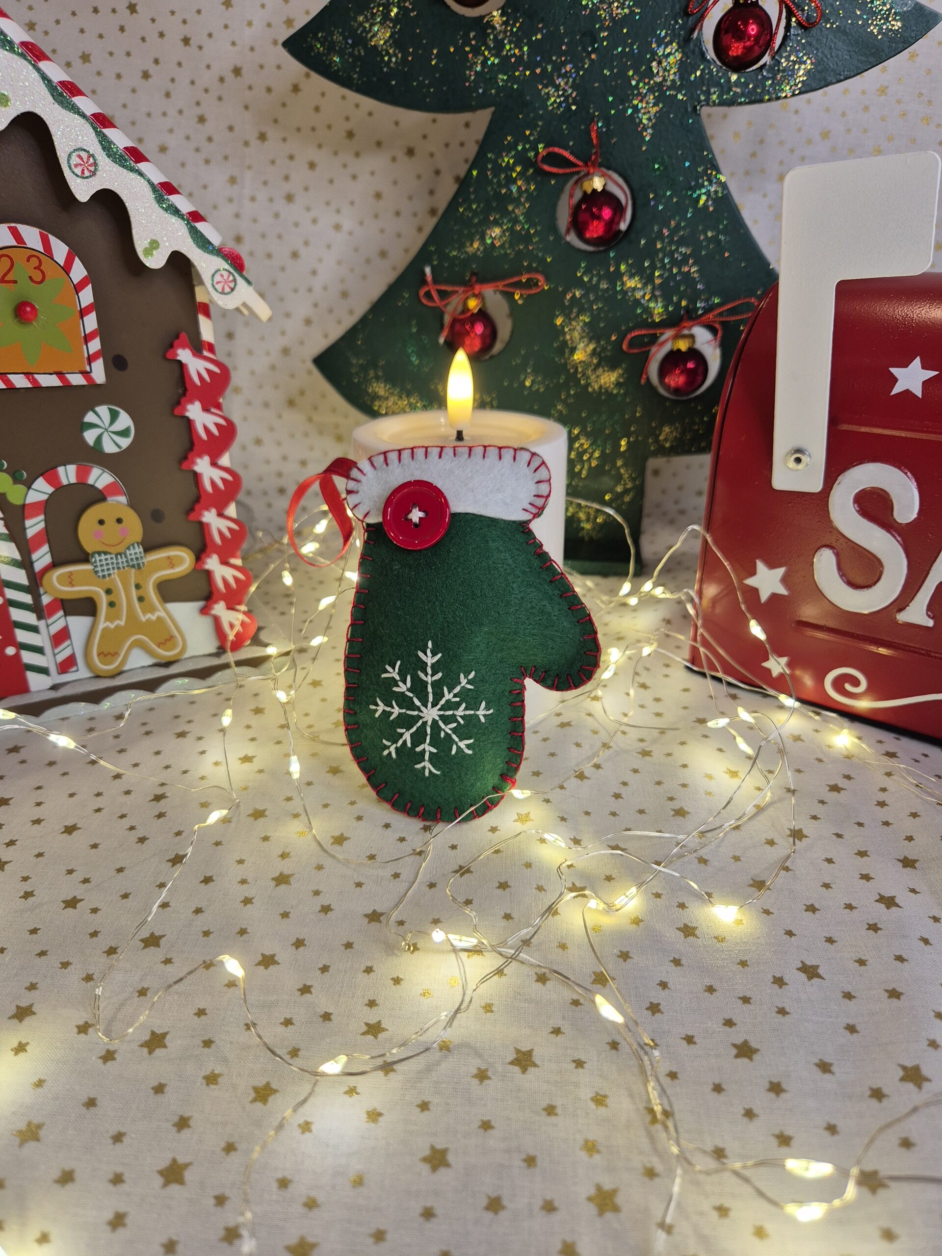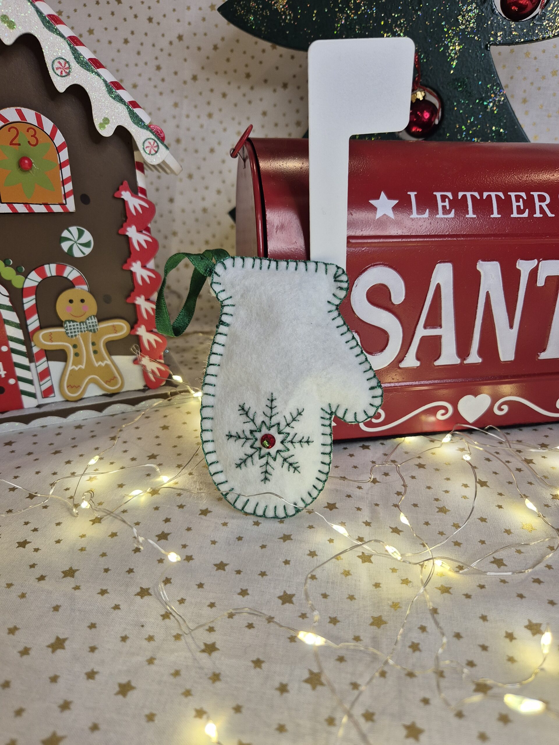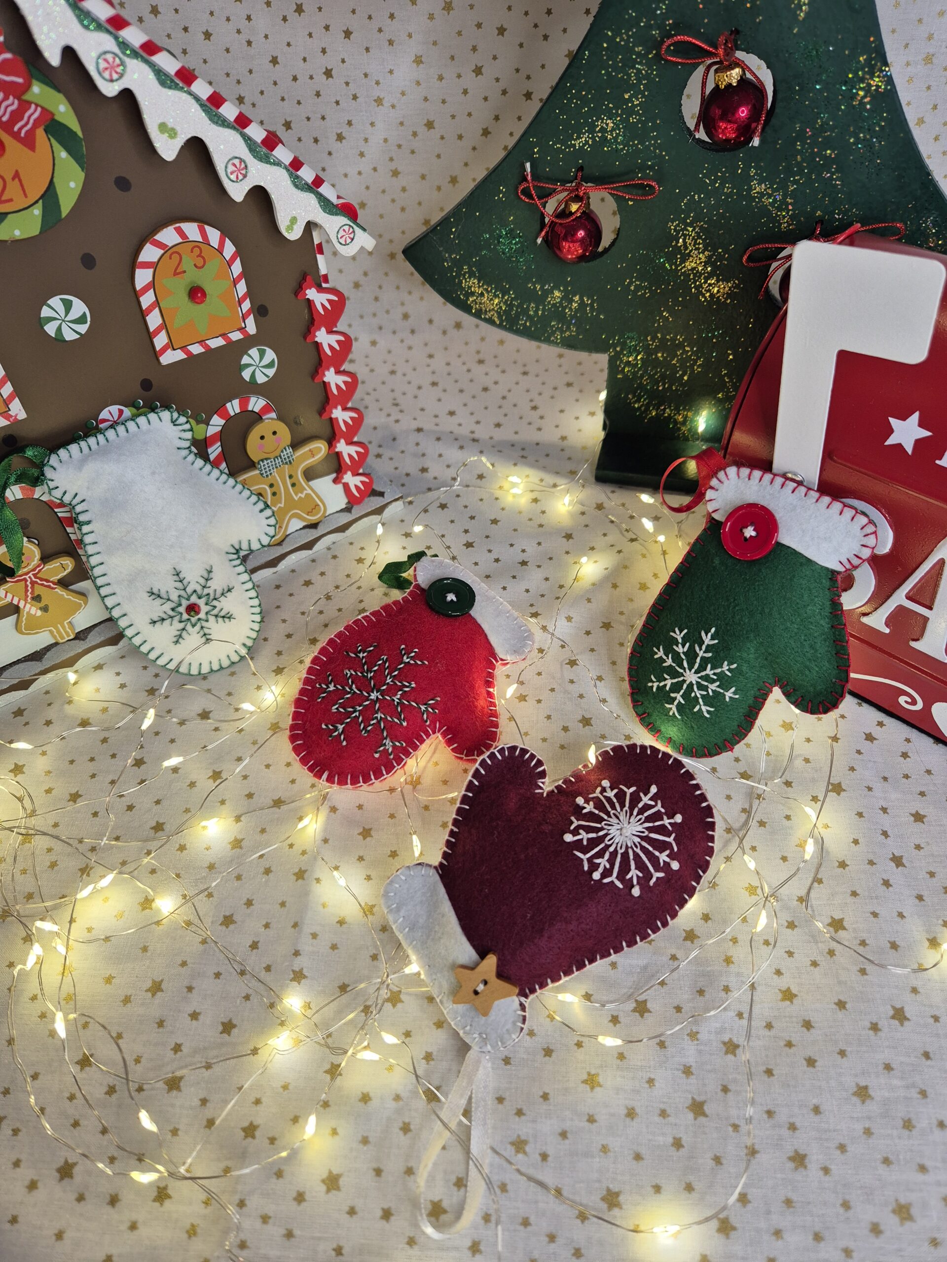 Décoration de Noël en forme de moufle faite en feutrine brodée à la main par mes soins avec des fils moulinés de marque DMC 100% coton à double mercerisé, certifiés Oeko-Tex et du fil de marque DMC Diamant selon le modèle.